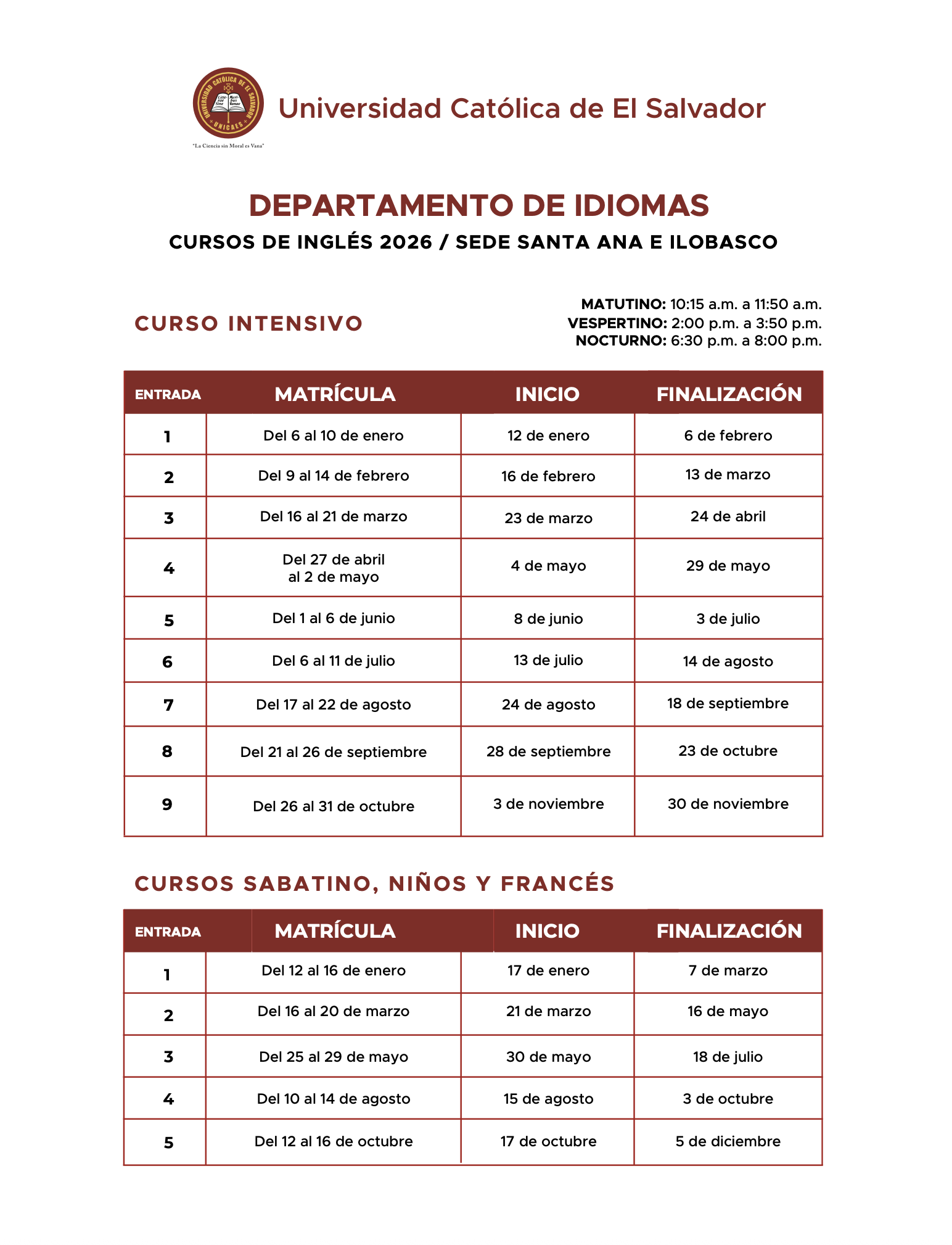 - Enviar comprobante de pago con su nombre completo al siguiente correo: idiomas@catolica.edu.sv.