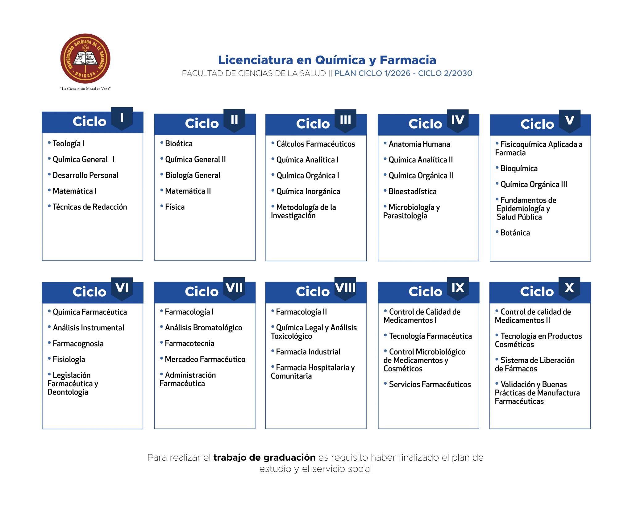 7. Cursar y aprobar 10 niveles de inglés en esta Universidad o aprobar un examen de suficiencia cuyo resultado indique que el estudiante posee conocimientos equivalentes a los mismos. Si el estudiante obtuviera un equivalente en niveles inferiores, deberá cursar los que le hicieran falta para completar el número antes indicado. La inscripción en estos niveles se puede realizar cuando el estudiante lo considere conveniente y se aprueba cada nivel con un promedio final mínimo de 7.0 (siete punto cero). Se recomienda Universidad Católica de El Salvador Facultad de Ciencias de la Salud Licenciatura en Química y Farmacia (Ciclo 01- 2026 al 02- 2030) Modalidad Presencial al estudiante cumplir con este requisito antes de obtener la calidad de egresado.
